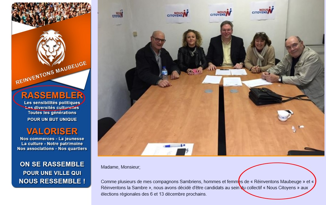 Par contre, là où c’est moins clair, c’est qu’il existe désormais un hiatus entre l’apolitisme reconfirmé de « Réinventons Maubeuge », et l’engagement de son leader. Contradiction tout à fait visible sur le nouveau site de ce collectif.